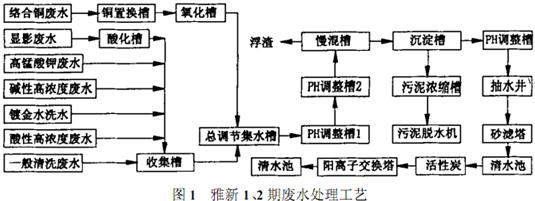 由圖1可知,雅新線路板生產車間按水質分7類廢水,除普通含銅廢水直接排入總調節集水池外,其他6種廢水分別排入6個小集水池,在進行預處理后,再排入總調節集水池。預處理主要有: