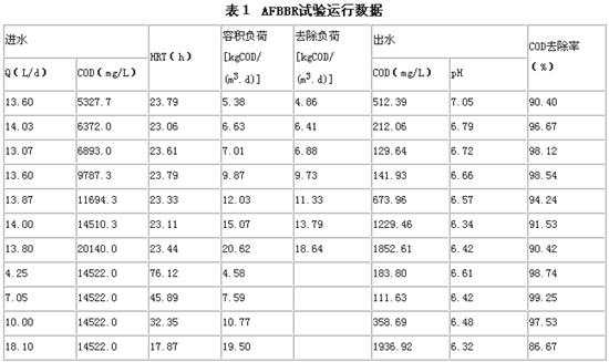負荷直接反映了食物與微生物之間的平衡關系,容積負荷的變化可以通過改變進水濃度或水力停留時間來實現。在試驗中,首先保持停留時間基本不變(平均為23.5h),進水COD濃 度從5327.7mg/L逐漸升高到20140.0mg/L,相應的容積負荷從5.38kgCOD/(m3•d)增到20.62kgCOD/(m3•d),COD去除率隨進水濃度增加而緩慢下降,最高達98.5%。之后,將進水濃度控制在14522mg/L,水力 停留時間分別為76.1245.89、32.35、23.11、17.87 h,相應的容積負荷從4.58 kgCOD/(m3•d)增到19.50kgCOD/(m3•d)。COD去除率隨水力停留時間的變化存在一個分界點 ,低于此值,COD去除率隨水力停留時間減小而迅速下降;高于此值COD去除率基本穩定。由表1可以看到,在試驗條件下,當容積負荷增高時,AFBBR的去除[kgCOD去除/(m3•d)]增高,顯示了強大的處理能力。