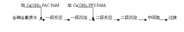 該廢水主要含有大量的F-離子和砷,這些F-離子以游離態形式存在于廢水中。添加Ca(OH)2作沉淀劑,通過小試確定PH值與氟化物殘留濃度曲線,在實驗區間會出現兩極小值,以這兩點PH值作兩次沉淀的基點,進行二次沉淀,嚴格控制PH值, 用鋁系無機聚合物強化共沉淀,可滿足F-離子的去除效率。