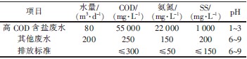 該企業的廢水種類復雜,成分多,其高濃度有機含鹽廢水為間歇排水,不僅含有生產中使用的有機溶劑,還含有生產過程中添加的酸、堿、鹽等,水質變化較大。根據廢水水質的特點,將全廠生產廢水分流為高COD 含鹽廢水和其他廢水兩大類,分別用兩根排水管道排至廢水處理站。該廢水處理工程的設計處理量分別為:高COD 含鹽廢水80 m3/d,其他工藝及廠區生活污水200 m3/d。廢水分類、水質、水量情況及排放標準見表1。