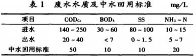 (2)設計參數:設計水量為120m3/d,廢水水質及中水回用標準見表1。