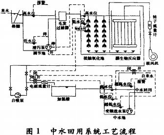 生物接觸氧化和膜生物反應器結合的中水處理工藝流程見圖1。