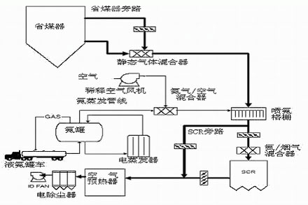 SCR工藝流程:還原劑 (氨) 用罐裝卡車運輸,以液體形態儲存于氨罐中;液態氨在注入SCR 系統煙氣之前經由蒸發器蒸發氣化;氣化的氨和稀釋空氣混合,通過噴氨格柵噴入SCR反應器上游的煙氣中;充分混合后的還原劑和煙氣在SCR反應器中反應,去除NOx。