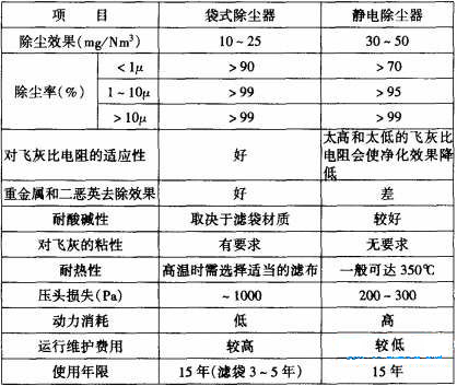 表2袋式除塵器與靜電除塵器性能比較表![]() |