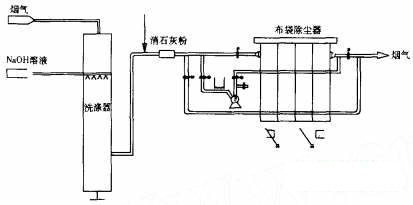 綜合法的工藝過程:在對煙氣進行處理時,向1000℃或650℃左右的高溫煙氣中噴入含有NaOH的溫堿水,在煙氣降溫的同時,NaOH與煙氣中的酸性氣體發生化學反應,降低了煙氣中的酸性氣體、重金屬和顆粒物的含量,隨后向含水量很高的煙氣噴入消石灰粉末,進一步凈化了煙氣。經過上述工藝處理后的煙氣,可以達到國家規定的排放標準。