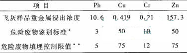 實驗焚燒飛灰的國標水平法浸出試驗結果示于表1。