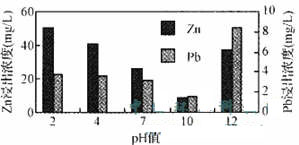 穩定化藥劑對重金屬的穩定效果受多種因素的影響,其中pH值的變化對其影響較為顯著,選擇以投加EDTA劑0.2%(質量百分比),利用HNO3和 NaOH調節穩定化試劑溶液的pH值為2、4、7、10和12的條件下,混勻和養護后,測定重金屬Pb和Zn的浸出濃度。結果如圖1所示。