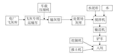 上海御橋生活垃圾熱能電廠和上海江橋生活垃圾熱能電廠的飛灰,采用干法收集的方法,由飛灰專用運輸車。運送至上海固體廢物處理中心進行安全填埋。一般采用水泥固化的方法,對飛灰中重金屬等有害物固化、穩定,然后進行填埋。具體的作業過程如下:飛灰由焚燒廠用專用罐車送至處置廠灰庫,添加適量的水泥或藥劑,進攪拌機加水予以攪拌,然后用輸送設備送至填埋坑攤平、壓實進行填埋見圖1。