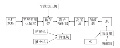 新的飛灰穩定化處置工藝,將焚燒廠飛灰裝人飛灰槽罐車后,直接運輸至填埋坑,用車載空氣壓縮機產生壓縮空氣,通過管道將飛灰送人專門設計的混合器,混合器的另一人口連接藥劑液管道,化學藥劑由液壓泵提供一定的壓力,灰、液經混合器噴射而出,利用兩者速度差,產生吸附作用,以達到充分混合目的,混合料直接進人填埋坑,然后進行攤平、壓實作業見圖2