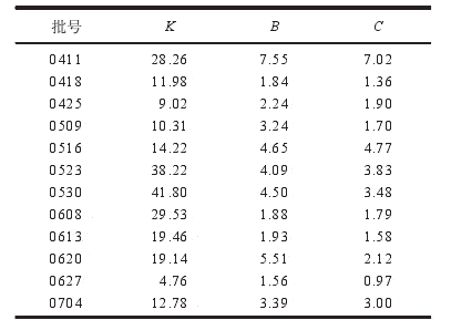 1)浸出液Pb含量采用雙硫粽分光光度法;2) K為飛灰穩定化處理前Pb浸出濃度,B,C分別為采用Na3PO4的B配比、C配比對飛灰進行Na3PO4穩定化處理后的Pb浸出濃度。