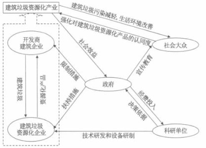 在政府對建筑垃圾非資源化處置行為的限制措施下,開發商和建筑企業把其產出的建筑垃圾輸送給建筑垃圾資源化企業,而資源化企業在借助政府的扶持政策和科研單位的技術支持下對建筑垃圾進行資源化處理,產出資源化產品,再把資源化產品銷售給開發商和建筑企業,使其得到循環利用,從而形成建筑垃圾資源化的產業循環鏈條。由此可見,在政府的干預下,開發商和建筑企業以及資源化企業相互作用,使建筑垃圾資源化產業順利運行。
