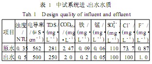 1.1 中試規模及設計進、出水水質中試系統設計水量為1m3/h,原水為市政自來水,設計出水水質達到國家《飲用凈水水質標準》(CJ94—2005)的要求。中試系統設計進、出水水質見表1。可知該市政自來水能夠穩定達到《生活飲用水衛生標準》(GB5749—2006)的要求,但相對于直飲水水質標準,其透明度與飲用凈水相比還有差距,總溶解性固體(TDS)、SO2-4、CODMn超標,氟化物(F-)濃度偏高,需作進一步處理。