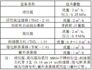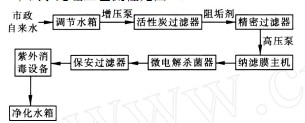 市政自來水先進入調節水箱,通過增壓泵進入活性炭過濾器,以消除自來水中的余氯、降低微量有機物的含量;膜前設精密過濾器,并在精密過濾器前投加阻垢劑;納濾膜出水經微電解殺菌器和紫外線殺菌器聯合殺菌后進入凈水水箱。