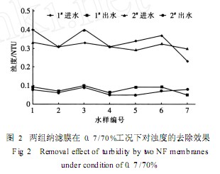 濁度是飲用水常規綜合性感官指標之一,其大小與水中細菌、病毒的含量有直接關系。兩組納濾膜在0.7/70%工況下對濁度的去除情況見圖2。