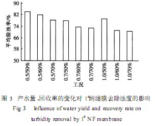 1#納濾膜在不同產水量(0.5~1.0t/h)、不同回收率(50%、60%、70%)下的除濁率見圖3。