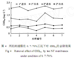 由于活性炭對有機污染物的吸附能力存在吸附飽和及隨原水中CODMn含量波動而波動的問題,因此在直飲水生產中尋求一種能較徹底地去除微量有機污染物的技術顯得尤為重要。兩組納濾膜在0.7/70%工況下,對自來水中CODMn的去除情況見圖4。