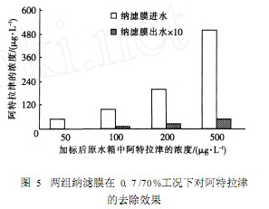 阿特拉津加標試驗共進行了四次。加標后,原水箱中阿特拉津的濃度分別為50、100、200、500μg/L,經活性炭過濾后出水中阿特拉津的濃度(即膜進水阿特拉津的濃度)分別為20、51、118、266μg/L。在0.7/70%工況、不同污染物濃度下,納濾膜對阿特拉津的去除效果見圖5(圖例“納濾膜出水×10”表示圖中數據為實際值的10倍)。