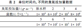 為此, 在實驗室又對單位時間內不同的臭氧投加量進行試驗, 當臭氧投加量為7. 0 ~ 8. 0 g/ m3時, 消毒已達到效果。具體結果見表2。