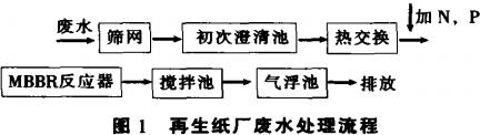 美國某一新建再生紙廠,最大處理量為1325m3/d。BOD5的質量濃度為350mg/L。經過一系列小規模試驗后,安裝2個串聯的MBBR反應池,每池容積81.7m3,總池容為163.4m3,。載體填充率為60%,總用氣量為1700m3/h。處理流程見圖1。浮渣用壓濾機脫水。此系統BOD,去除率達95%。MBBR反應器后續氣浮池出水排人附近河流。