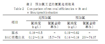 結合沙口水廠的生產實際情況, 在該研究中也采用了預加氯工藝。但預加氯條件下, 若余氯過高有可能殺死部分微生物或抑制部分微生物的活動,影響生物活性炭的凈水效能。為確定預加氯工藝是否會較大地影響 BAC的氨氮的去除效果, 先進行了預加氯和無預加氯的對比試驗,預加氯條件下, 嚴格控制沉淀池出水余氯≤0.1mg/L。試驗結果如表 2。