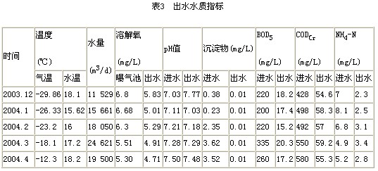本污水處理工程設計能力為二條線50 000 m3/d,目前單線運行,實際運行水量25 000 m3/d。本工程于2003年11月開始調試,12月正式投產,在這半年調試投產運行中經過了最寒冷季節-40℃的考驗,在處理后的出水,pH值、沉淀物、化學需氧量、氨氮等水質指標均能達到排放標準。見表3。