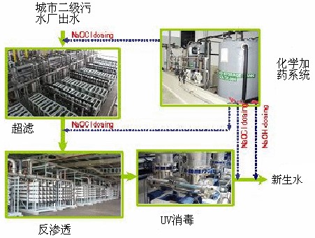 實里達新生水廠的工藝流程與勿洛新生水廠的工藝流程類似。采用超濾、反滲透、UV消毒三段來凈化城市二級污水廠出水。工藝流程如下圖所示: