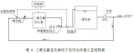 加氯點選在清水池進水口處并能保證消毒氣體在水中分散均勻的地方,一般復合二氧化氯發生器運行時可實現自動控制,根據清水池進水流量信號或清水池出水的余氯探測信號自動控制發生器進料計量泵的流量,調節發生器的產量,其工藝如圖1。