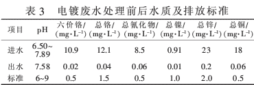 (5)污泥處理。濃縮池內污泥經板框壓濾機脫水,風干后出售給廣東某金屬冶煉廠對污泥中貴重金屬進行提煉,使污泥作為下游產業的原料有效利用,經檢測污泥中主要重金屬質量分數(g/kg):總鉻6.28、總鎳2.21、總銅9.48。濃縮池上清液則回流至含鉻廢水調節池,進入下一批次處理。
