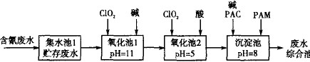 根據實際廢水特征及處理要求。本工程設計采 用的處理工藝見圖1。含氰、含鉻廢水分別進行預處 理,預處理工藝見圖2、圖3。預處理后的含鉻、含氰 廢水排人廢水綜合池中與酸堿廢水混合。將混合廢 水泵至堿化反應池加堿調節pH=9.5后,流至絮凝 池進行絮凝反應,反應完成后排至沉淀池中沉淀,出 水經調節pH后排放。沉淀污泥送人廂式壓濾機脫 水,泥餅外運,濾液返回廢水綜合池。