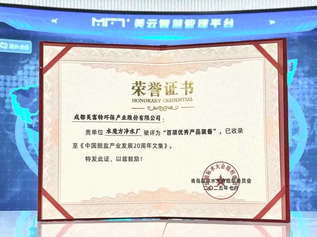 來源:成都美富特環保產業集團有限公司 閱讀:1443 更新時間:2025-07-17 14:232025年7月2日,第二十屆青島國際水大會&水展在中鐵·青島世界博覽城盛大啟幕,眾多行業領軍企業與專家學者齊聚一堂,共同探討水資源、水環境與水生態的可持續發展之道。在這場水務界的“頭號秀場”上,自主研發的“水魔方裝配式凈水廠”憑借其在綠色低碳領域的創新與顛覆,成功入選“百項優秀產品裝備”。