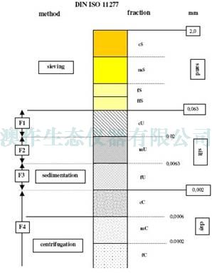 根據stokes’定律,大顆粒的沉降速度較快,小顆粒的沉降速度較慢,把土壤樣品放到液體中制成一定濃度的懸浮液,懸浮液中的顆粒在重力作用下將發生沉降,因此可以根據不同粒徑的顆粒在液體中的沉降速度不同來測量粒度分布。具體方法為移液管法:將土壤樣品有機質去除,然后將過篩(0.05mm)后的細土10g放入1000ml焦磷酸鈉溶液中,用移液管在不同深度不同時間內緩慢吸取一定量的懸浮液樣品,烘干后稱重,即可算出不同粒徑范圍的土壤粒徑分布百分比。土壤粒徑分布歐洲標準(DIN ISO 11277)分為4級(F1、F2、F3、F4),美國標準(ASTM)分為兩級(F1和F2),具體分級情況如下:
