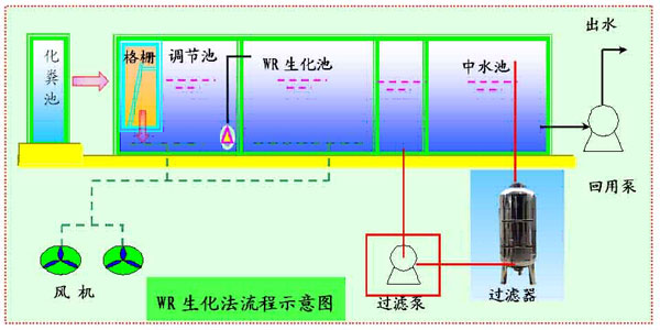 北京沃特瑞斯科技發展有限公司根據原水水質的不同,研發出兩種處理工藝:WR生化法工藝和MBR工藝,當原污水是生活污水時,采取WR生化法工藝,當原水是優質雜排水時采用MBR工藝。
