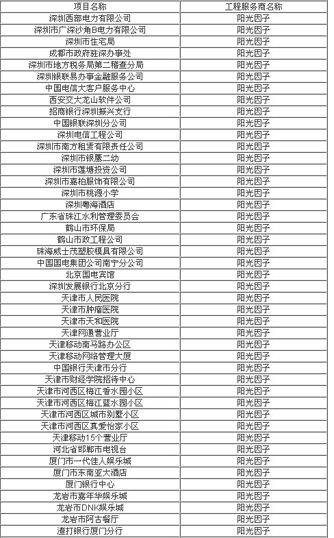 我司目前在國內市場已有北京、天津、福建、山東等三十多個省市區域代理商,專業經營、施工我司生產的陽光因子光氧觸媒。產品成功應用于國內各大、中城市的 醫院、學校、酒店、標志性建筑工程、住宅區等,累計施工服務面積近二百萬平方米,并取得了良好的效果。現對部分已施工的項目統計如下: