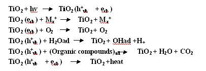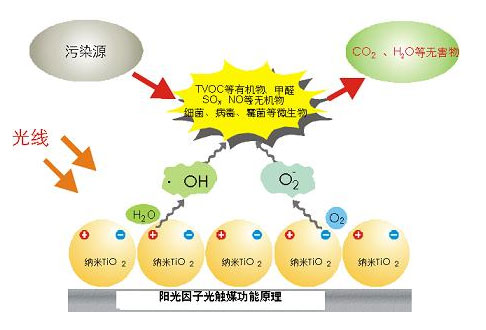 在光照條件下,該涂層的納米二氧化鈦能產生電子(e–)躍遷,與空氣中的氧反應,產生O2–(負氧離子)。電子躍遷后留下的空穴(h+)會與空氣中的水反應形成反應活性很高的·OOH或·OH(氫氧自由基)。由于生成的自由基具有很強的氧化、分解能力,可破壞有機物中C–C鍵、C–N鍵、C–O鍵、 H–O鍵、N–H鍵,因而具有高效的分解有機物的能力。并將它們分解成水和二氧化碳和無害物。