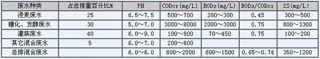 目前我國啤酒生產廢水主要來自麥芽車間。有浸麥廢水;糖化工段的糖化、過濾和洗滌廢水,發酵工段的發酵廢液和洗槽廢水,灌裝車間的洗瓶水、滅菌用水及瓶破碎時渣出的少量啤酒,其它廢水包括冷卻水,地面沖洗水等。各股廢水的污染物濃度詳見表1。