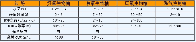 (1)生物塘法:又分好氧、兼氧、厭氧和曝氣生物塘4種,其特征如表: