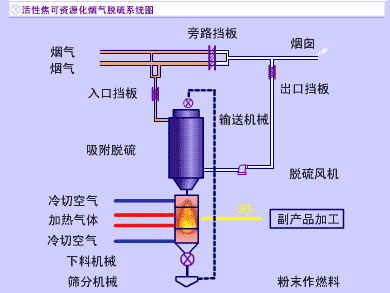 活性焦脫硫系統由活性焦吸附脫硫裝置、解吸再生系統、脫硫劑輸送系統和SO2氣體加工處理系統組成。