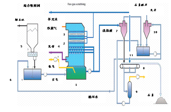 1、吸收劑槽 2、吸收帶 3、除霧器 4、氧化鼓風機 5、吸附劑倉 6、新配制的洗滌懸吊槽 7、石膏漿旋流器站 8、真空皮帶過濾器 9、真空泵 10、廢水旋流器站 11、循環水槽
