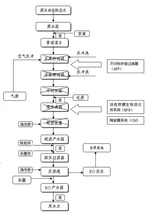 本設計方案采用水質調節+不對稱纖維過濾系統(AFF)+活性炭膜生物流化床過濾系統(BFB)+陶瓷膜過濾(CM)+反滲透系統(RO)后,水質達到電導率300us/CM以下要求符合國家《循環冷卻水水質標準》,回用于車間各個用水點。
