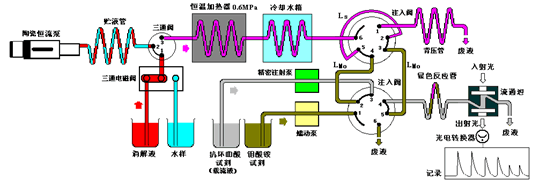 儀器的陶瓷恒流泵間隔吸入過硫酸鉀氧化消解液和水樣在貯液管中,再將其推入加熱的反應毛細管中擴散,形成消解液和水樣混合,在高溫高壓下,水樣中的各種磷化合物經過過硫酸鉀氧化消解轉變成正磷酸根離子(PO43-)。用鉬酸銨、酒石酸銻氧鉀和被抗壞血酸作載流液,消解后的水樣被注入閥定量切入載流液中,進入顯色反應管,在強酸性條件下,正磷酸根離子與鉬酸銨、酒石酸銻氧鉀反應生成磷鉬雜多酸,再被抗壞血酸還原后生成藍色配合物流經比色計的流通池內,測量其光電壓變化值,通過其峰高或峰寬,可求得樣品中的TP含量。儀器每天自動做一次標定。