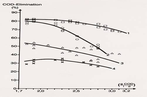 圖2:紙漿廠漂白污水在不同材料上的厭氧處理分析 1. LEVAPOR,2.褐煤焦炭顆粒,3. 聚氨酯泡沫體,4. 懸浮污泥 |