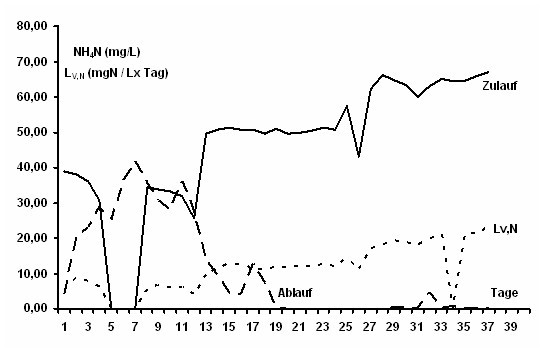 幾天以后硝化過程就建立并且很穩定地運行,然后逐漸升高氨氮負荷硝化過程也不會受到破壞。結果見下圖。第一天到第八天采用活性污泥法,第10天到第38天采用LEVAPOR生物膜法。
