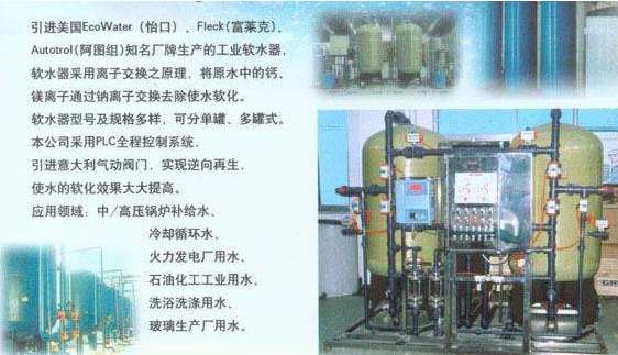 引進美國怡口、富萊克、阿土組知名廠牌生產的工業軟水器,軟水器采用離子交換原理,將原水中的鈣鎂離子通過鈉離子交換去除使水軟化。軟水器型號及規格多樣。可分單罐、多罐多罐式。本公司采用PLC全程控制系統。引進意大利氣動閥門,實現逆向再生,使水的軟化效果大大提高。