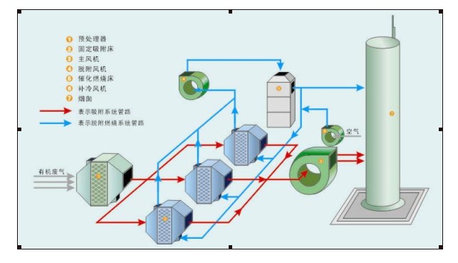 經預處理的廢氣通過氣體凈化吸附床,吸附床中的活性炭將廢氣中的有機成份吸附在內部微孔結構中,凈化后的潔凈氣體通過煙囪達標排放。每套裝置設二至四臺吸附床,即一臺吸附床處于脫附再生階段或備用階段外,其它吸附床處于吸附階段,從而使凈化系統可連續運行,不影響車間正常生產。
