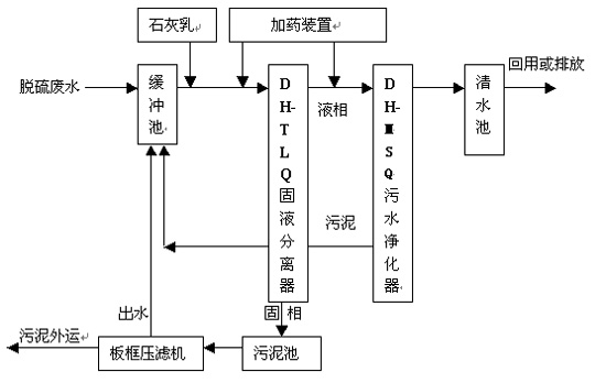 對鍋爐煙氣濕法脫硫廢水處理的處理效率、水質穩定、污泥處理等幾個方面的考慮,以實現穩定的水閉路循環為目的,本所開發的DH-TLQ脫硫工藝典型工藝流程如下: