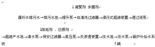 循環水排污水收集至排污水池,經泵提升,投加凝聚劑、殺菌劑后送入自清洗過濾器(過濾等級為200?m),濾后水送入浸沒式超濾膜池(負壓抽吸),通過透過液泵送入超濾產水池。后通過清水泵提升,投加還原劑、阻垢劑后,依次送入保安過濾器、高壓泵、反滲透裝置,淡水送入淡水池,作為鍋爐補給水的水源或循環水補充水,反滲透濃水排至廠區廢水收集池。