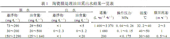 Simms等人采用了高分子膜和MembraloxÒ陶瓷膜對加拿大西部的重油采出水進行了處理,其通量相對較小。表1是以上研究工作主要結果,從中可以看出,采用陶瓷膜處理油田采出水是可行的,出水水質均能滿足回注水的要求。國外對這一研究工作已進行了10年,國內也開展了3年的研究,目前尚處于工業性試驗階段,難以大規模工業應用的原因在于:其一是成本問題,必須降低裝置的一次性投資,并通過工藝條件的優化設計,強化傳質過程,降低操作成本;其二是膜的清洗再生方法,由于各油田的水質情況差別很大,必須針對具體對象開發合適的清洗方法;其三是如何能夠長時間維持膜通量的穩定性,減少清洗次數。根據目前陶瓷膜的發展趨勢和研究工作進展,采用陶瓷膜處理油田采出水的工業應用是可能的,但必須進行大量的基礎和工程研究工作。