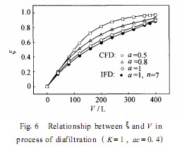 實驗采用南京九思高科技有限公司生產的多通道陶瓷膜及過濾裝置,加料為200L頭孢菌素C發酵液,頂洗劑為pH2.5的去離子水,控制K=1,ac=0.4。采用CFD操作模式,分別在a=0.5、0.8、1.0條件下進行實驗;采用IFD操作模式在a=1、n=7條件下進行實驗。實驗結果用不同符號在圖6中進行了標記,曲線為據式(6)和(9)得到的理論值。由圖6可知,在不同操作條件下,計算值與實驗結果在整個實驗過程中都是一致的,實驗點與理論線之間的誤差小于2%。