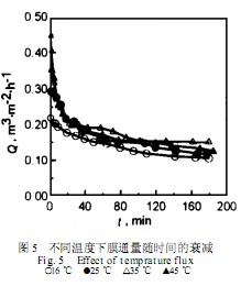 溫度對過濾過程的影響比較復雜。溫度上升,滲透液的粘度下降,擴散系數增加,減少了濃差極化的影響。但溫度上升會使料液的某些性質改變。如會使料液中某些組分的溶解度下降,使吸附污染增加[9]。溫度的改變也會影響膜面及膜孔與料液中可引起污染的成分的作用力,這些都會影響過濾的性能。對于本實驗體系料液的主要成分是油滴、表面活性劑、水及其它一些雜質。溫度對過濾通量的影響主要是溫度對液體粘度的影響、溫度對料液中油滴粒徑分布及油滴與膜表面作用力的影響。圖5的操作壓差為0.1MPa、膜面速度為7m/s,不同溫度下膜通量隨時間的衰減曲線。可以看出溫度與過濾起始通量的影響較為顯著。這主要是粘度的改變所致。但是膜通量在高溫下的衰減較為迅速,隨著溫度的升高,膜通量下降幅度增大,尤其是溫度上升到45℃時,穩定時通量較35℃時小。因此,可以認為,溫度升高,雖然滲透液的粘度減小,并可以改善濃差極化的影響,有利于提高膜通量。但另一方面,溫度升高,使膜孔及膜表面對料液中可引起污染的組分的作用力改變,降低了膜通量。溫度在35℃以下時,前者的影響起主要的作用。溫度繼續升高,后者的影響逐漸增大。因此較為適合的操作溫度應在35℃左右。