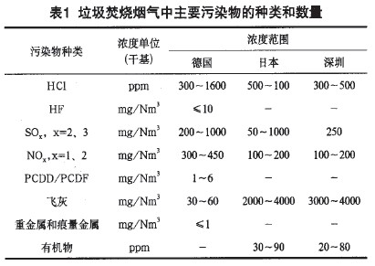 此外,垃圾焚燒爐窯器中還含有重金屬和痕量金屬鉛、鋅、汞、鈷、鉻等,其中鉛和汞的濃度較大,達mg/Nm3數量級。垃圾焚燒煙氣中主要污染物的種類和數量見表1。